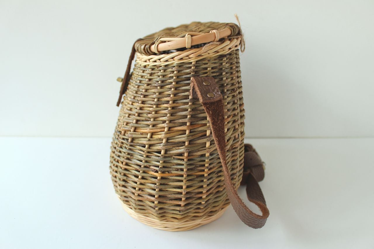 ポシェット型の大きめのバスケットです。蓋が付いていて、レザーのストラップがついています。身体に触れる面は、身体のラインに沿うようやや湾曲に編まれています。サイズ感のイメージのため、8枚目の画像ではiPadを縦に入れてみました。