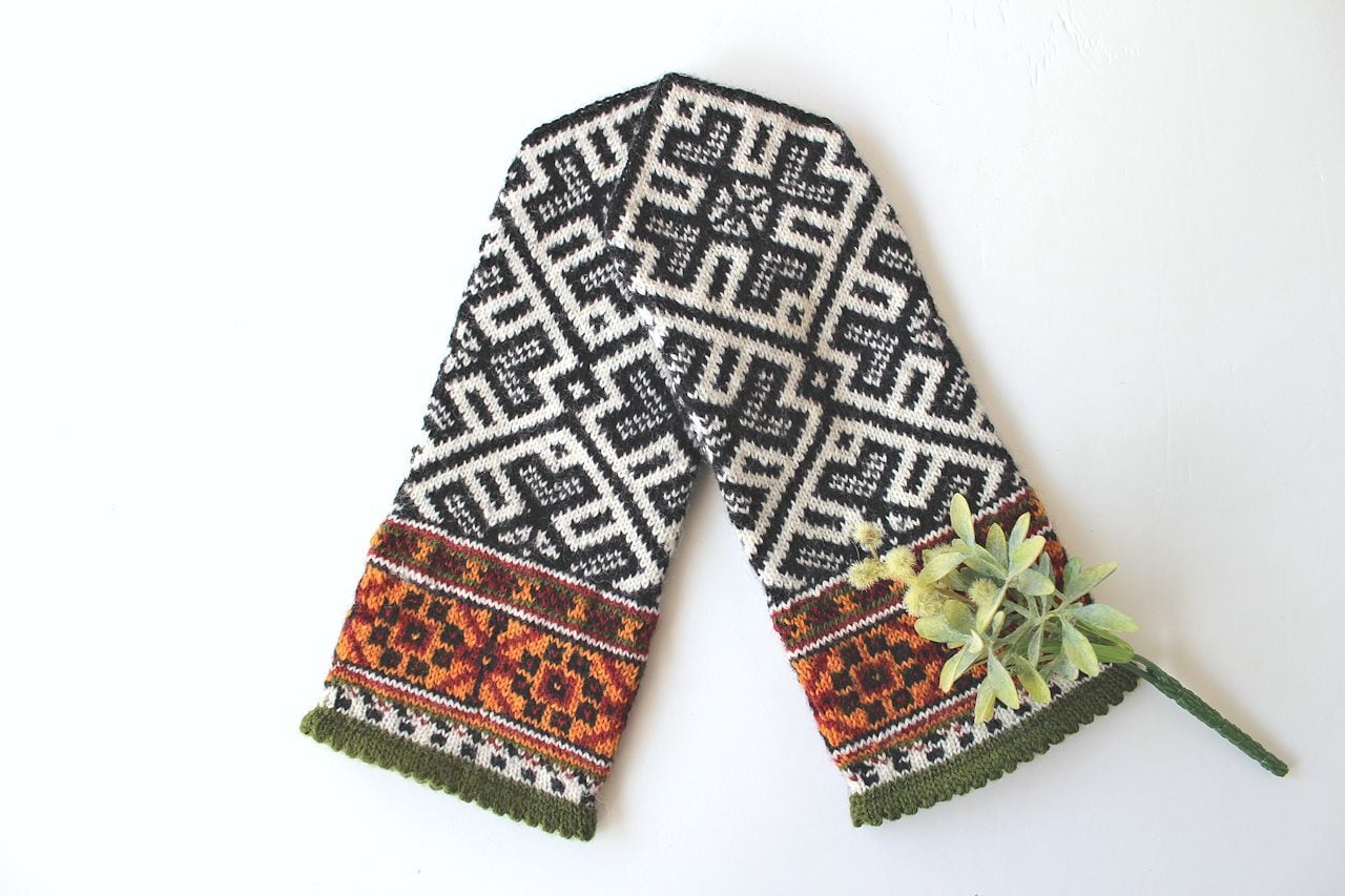 三角頭のミトンはラトビアの宝物。防寒具としての役目以外にも様々なしきたりの小道具として古くからその技術が受け継がれてきました。細い毛糸で緻密に編まれていますので、見た目の美しさはもちろんのこと保温性に優れています。裏面の毛糸の渡り方を見るとその細かさがよく分かります。親指部分もきちんと編みこまれています。