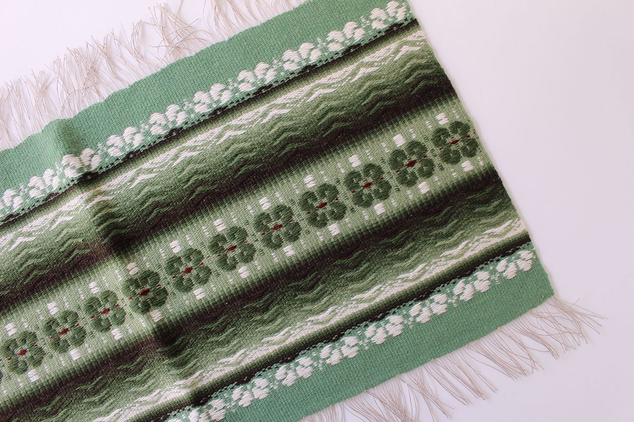 ラトビアで織られたウール&リネン製の織物です。ラトビア北東部のリンバジ村にあるこの工房は創業110年を超える老舗の織物工房で、腕利きの職人さんたちがその技術を支えています。この商品は、フォークロアテイスト溢れる美しいテーブルセンターです。縦糸にリネンを、横糸にウールを使い、織り上がるまでの全工程が手作業で仕上げられています。別カラーの画像ですが、5枚目の写真の通り、1:2の比率の長方形ですので端を縫い合わせるとクッションカバーとしてもお使いいただけます。