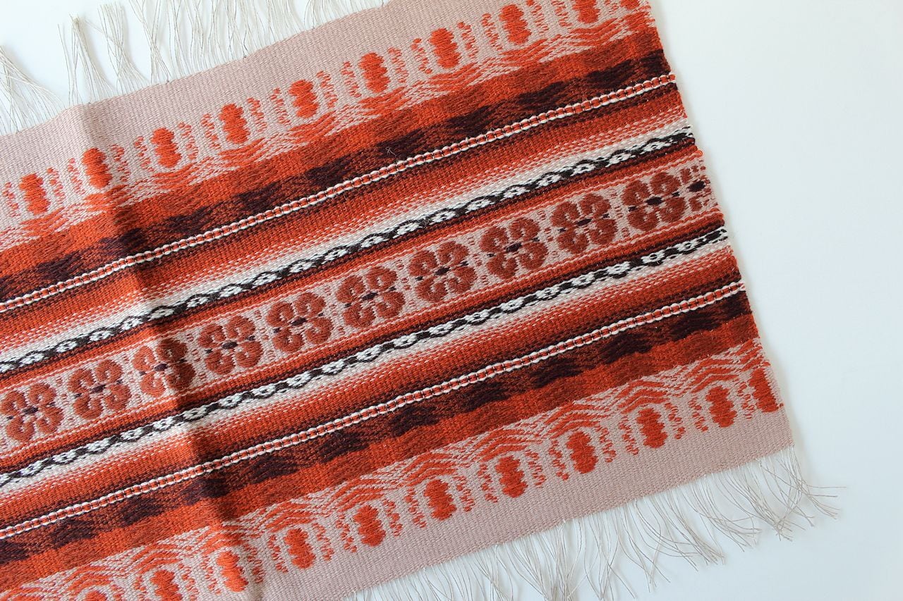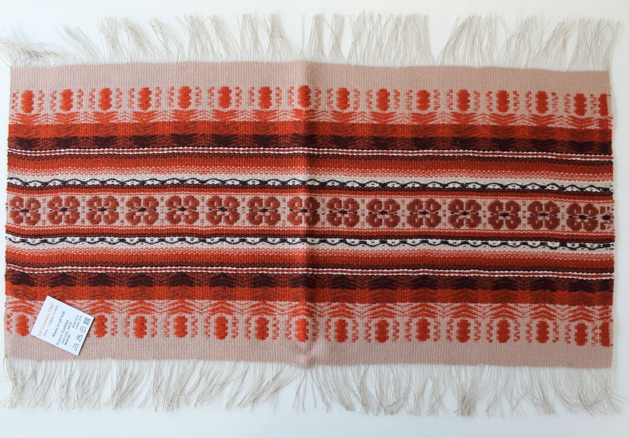 ラトビアで織られたウール&リネン製の織物です。ラトビア北東部のリンバジ村にあるこの工房は創業110年を超える老舗の織物工房で、腕利きの職人さんたちがその技術を支えています。この商品は、フォークロアテイスト溢れる美しいテーブルセンターです。縦糸にリネンを、横糸にウールを使い、織り上がるまでの全工程が手作業で仕上げられています。別カラーの画像ですが、5枚目の写真の通り、1:2の比率の長方形ですので端を縫い合わせるとクッションカバーとしてもお使いいただけます。