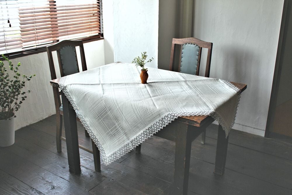 5枚目の写真は長辺 106cm x 短辺 68cm のテーブルに使用している様子です(別柄、同サイズのクロスで撮影しています)。
