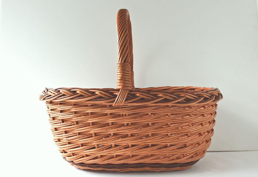 サイズ: 上端46x37cmの楕円、底の34x24cm、持ち手含む高さ40m、中央部の深さ18cm 程度