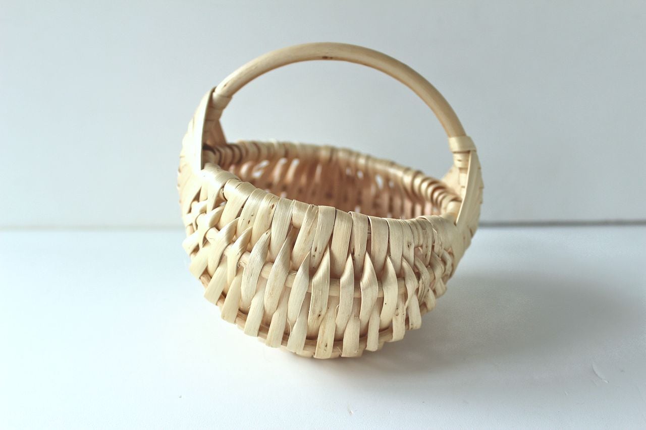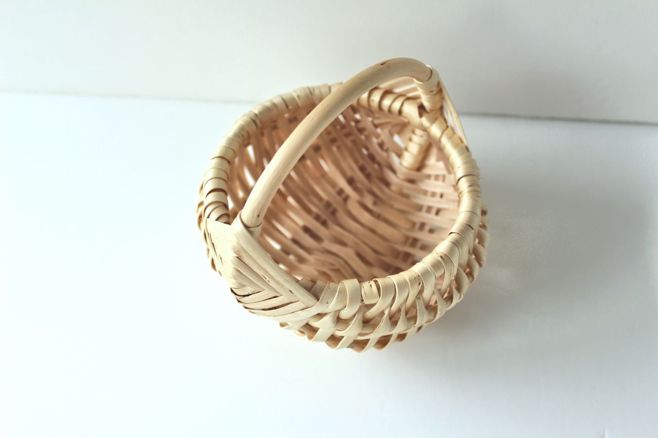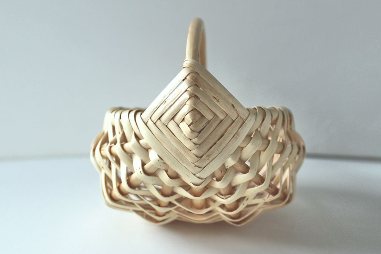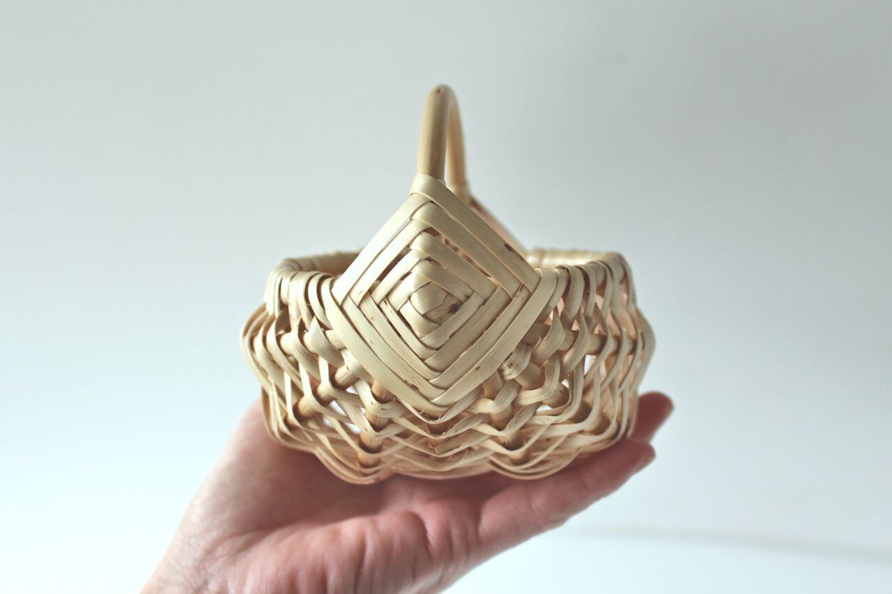 伝統的な留め方が美しいバスケットで、コロンとかわいい形です。小さなサイズです。