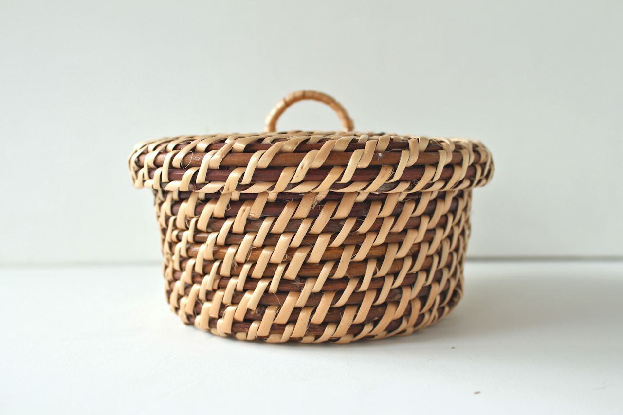 丁寧に編み込まれた細枝みの入れ物型のバスケットです。蓋がついているので小さな小物の整理などにピッタリです。