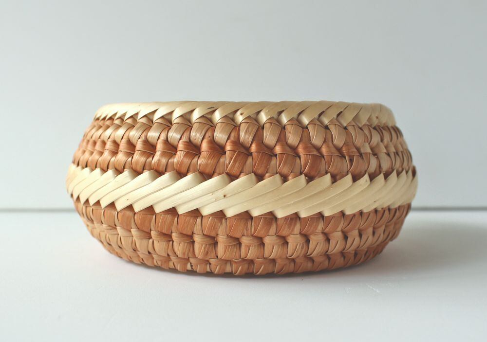 このバスケットは編みの技術が駆使されたとても凝った作りで大変美しいです。小さなサイズですので、小物の整理にご活用ください。